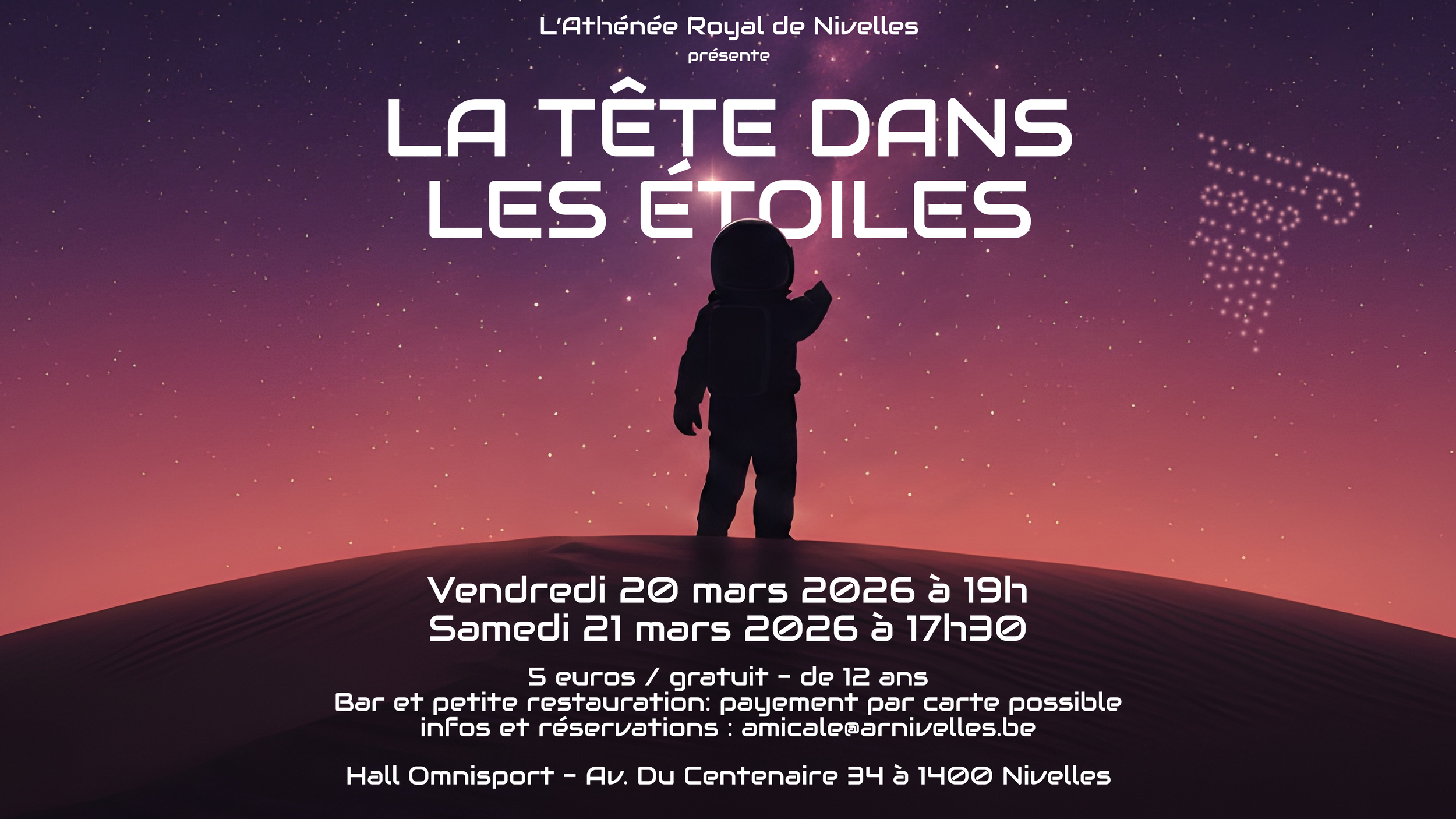 Le temps d’une soirée, laissez-vous emporter dans un univers rempli d’étoiles, de musique et de créativité, et venez découvrir le talent, l’énergie et l’imagination de nos élèves et de leurs enseignants lors d’un moment festif et convivial.